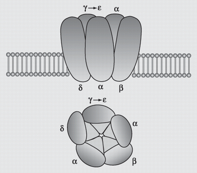 Až dosud se zrychlení synaptického přenosu připisovalo většinou jenom tomu, že se v určitém období po narození (u laboratorního potkana dvanáctý až patnáctý den) mění program výroby receptorů – v synaptických membránách neuronů se pomalé a nízkovodivé receptory pro neuropřenašeče nahrazují novými typy. Ty se otevírají rychleji a synchronněji, prochází jimi větší iontový proud. Tato představa vyplývala mj. i z našich nálezů v šedesátých letech, kdy jsme objevili na nervosvalové synapsi dva typy acetylcholinového „nikotinového“ receptoru-kanálu, jeden pomalý denervační (později prokázaný jako embryonální), druhý rychlý „dospělý“. 1) Přeměna „pomalého“ embryonálního receptoru-kanálu na „rychlý“ je dána změnou výrobního programu v jednom ze čtyř typů podjednotek formujících mezi sebou kanál (obrázek 1).