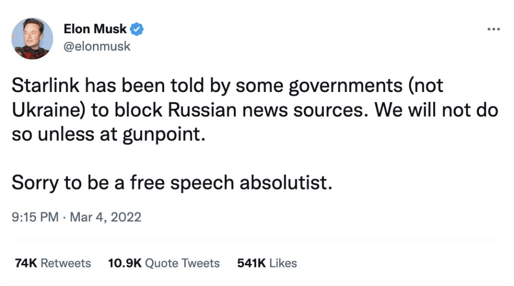 Elon Musk tak usnadnil státním propagandistickým kanálům šíření dezinformací na Twitteru tím, že se postavil proti zablokování Russia Today, když Rusko napadlo Ukrajinu. „Vlastně mi jejich zprávy připadají docela zábavné,“ napsal tehdy Musk svému příteli. „Spousta keců, ale taky pár dobrých postřehů.“