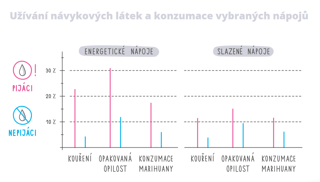 Všimli jsme si, že časté popíjení energetických a slazených nápojů se váže k dalším faktorům charakteristickým pro rizikové chování školáků – jde především o kouření, opakovanou opilost a konzumaci marihuany. Ve skupině dětí se zvýšenou spotřebou obou typů nápojů tak najdeme významně více kuřáků nebo konzumentů alkoholických nápojů. V případě energetických nápojů je tato vazba velmi silná, u limonád o něco méně.