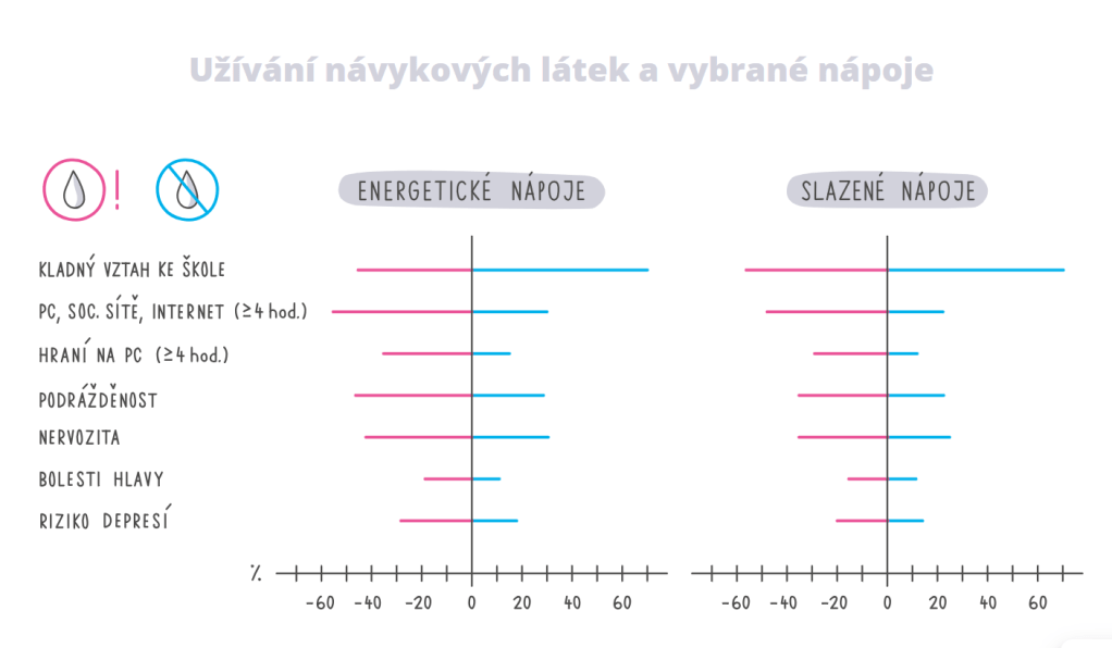Spotřeba slazených nápojů u českých dětí dlouhodobě klesá. Za posledních 12 let se počet školáků, kteří denně pijí limonády, snížil na polovinu. Premiérově se naše studie zaměřuje i na energetické nápoje. Zjistili jsme, že více než desetina mladých Čechů má sklon k jejich rizikové konzumaci. Na třicet tisíc českých školáků ve věku mezi 13 a 15 lety je tak ohroženo jak řadou zdravotních rizik spojených se zvýšenou konzumací těchto nápojů, tak dalšími faktory, které s jejich pitím podle našich zjištění souvisí – ať už jde o kouření, opakovanou opilost, agresivitu nebo potíže se spaním.