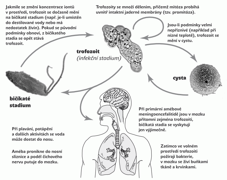 Nemoc se projevuje nejprve bolestí hlavy, horečkou, nevolností, během několika dní pacient upadá do bezvědomí a umírá. Nákazu mohou vyvolat améby po proniknutí do organismu nosem, odkud se podél čichového nervu přesouvají do mozku a napadají nervovou tkáň. Pitím vody se nakazit nelze a nemoc není přenosná.