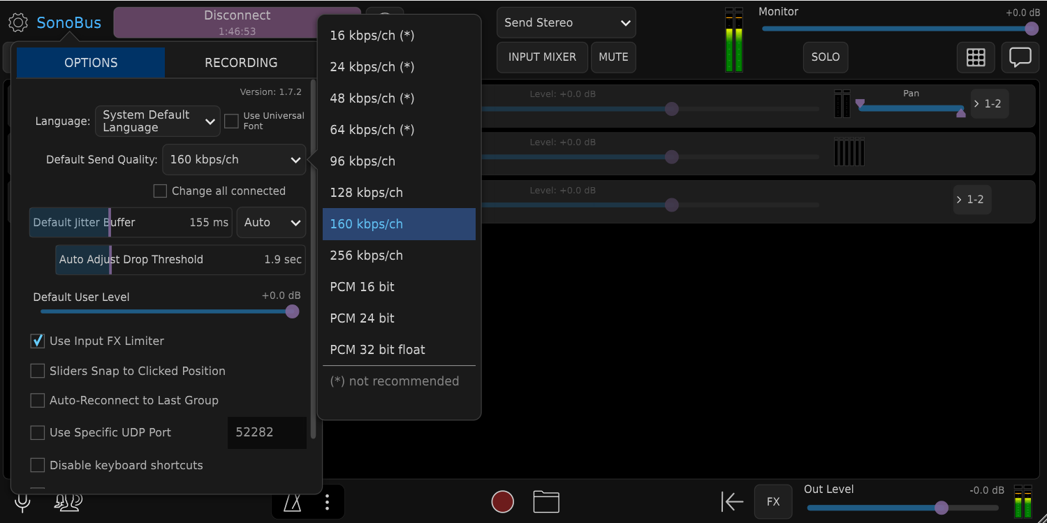 SonoBus nepoužívá žádné potlačení ozvěny ani automatickou redukci šumu, protože preferuje zachování nejvyšší kvality zvuku. V důsledku toho, pokud použijete pro živý zvuk signál z mikrofonu, budete muset použít sluchátka, abyste zabránili ozvěně a/nebo zpětné vazbě.