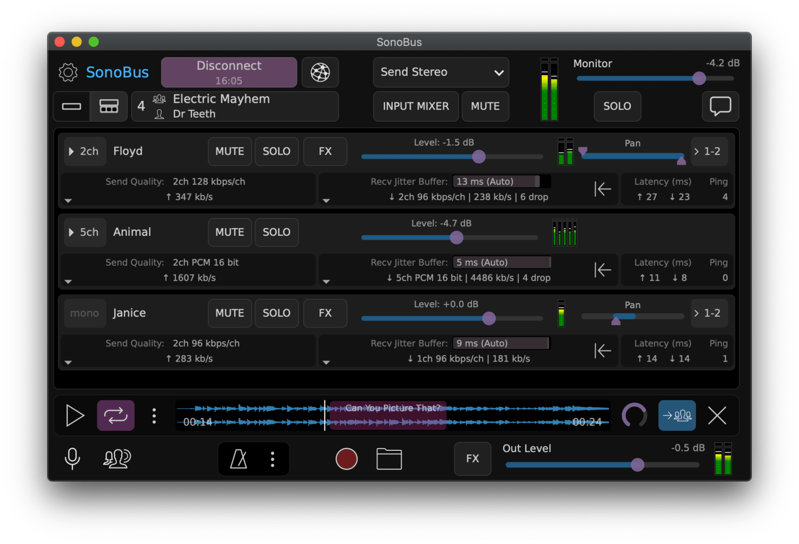 SonoBus je snadno použitelná aplikace pro streamování vysoce kvalitního zvuku s nízkou latencí mezi zařízeními přes internet nebo místní síť. Umožňuje spojení více uživatelů dohromady a umožňuje odesílat a přijímat zvuk mezi všemi ve skupině s přesnou kontrolou latence, kvality a celkového mixu. Obsahuje volitelné efekty vstupní komprese, šumové brány a ekvalizéru spolu s hlavním reverbem. Všechna nastavení jsou dynamická, statistiky sítě jsou jasně viditelné.