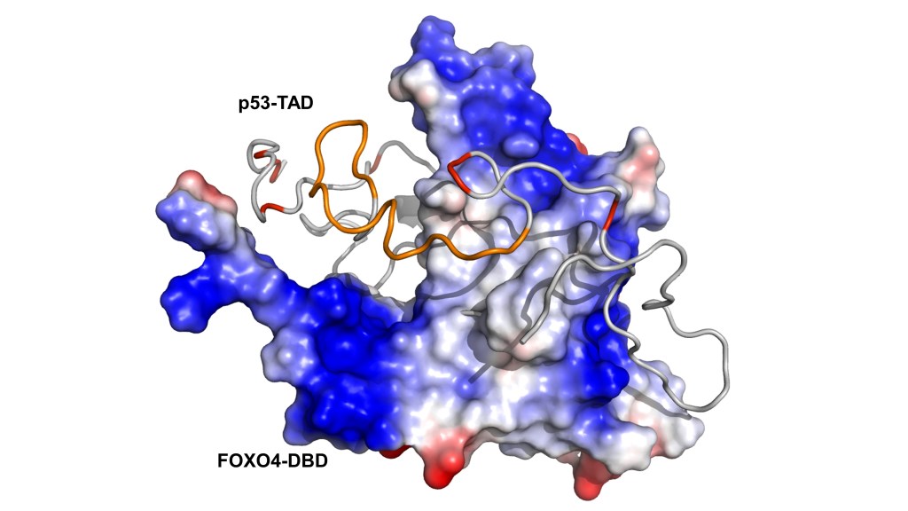 Transkripční faktory a tumorové supresory FOXO4 a p53 regulují stárnutí buněk a jejich deregulace je spojena s řadou onemocnění, včetně rakoviny. Za stresových podmínek dochází k podpoře buněčné senescence díky interakci Forkhead DNA vazebné domény proteinu FOXO4 s transaktivační doménou proteinu p53. Tato interakce způsobuje sekvestraci p53 a zvýšení transkripce proteinu p21, který je regulátorem buněčné senescence. Týmy z katedry fyzikální a makromolekulární chemie PřF UK, Ústavu organické chemie a biochemie AV ČR a Fyziologického ústavu AV ČR v této nové studii ukázaly, že interakce mezi p53 a FOXO4 jsou vysoce heterogenní. Pomocí metod jaderné magnetické resonance a molekulového modelování vědci ukázali, že transaktivační doména p53 interaguje s N-koncovou oblastí Forkhead domény FOXO4, přičemž v komplexu zůstává značně flexibilní. Studie dále ukázala, že p53 interaguje s FOXO4 různými způsoby, což způsobuje značnou strukturní variabilitu tohoto komplexu.