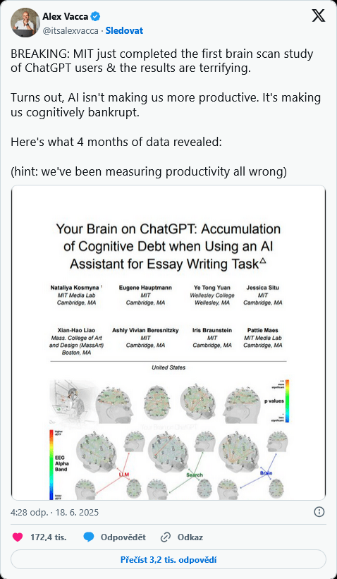 Nová studie vědců z Massachusettského technologického institutu (MIT) popsala, jak používání umělé inteligence zpomaluje mozkovou aktivitu. V průběhu několika měsíců vědci sledovali skupinu o 54 lidech při psaní esejů. Ti, kteří používali ChatGPT, se každým dalším textem stávali línějšími a na konci studie se často uchylovali k pouhému kopírování a vkládání textu.