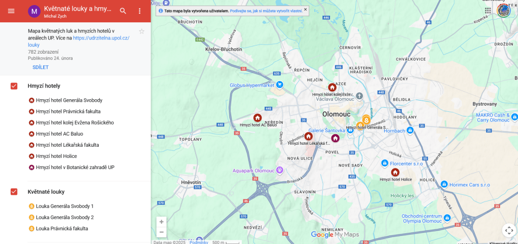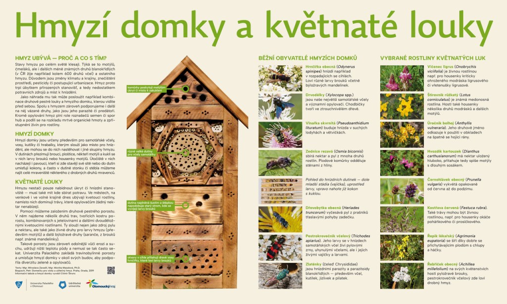 Úkryt a hnízdní stanoviště hmyzu poskytují blízké hmyzí domky. Zajímavé informace se mohou nejen studenti a zaměstnanci univerzity, ale i veřejnost dočíst na informačních tabulích, které louky i hotely doprovázejí. V blízkosti kolejí nyní kvetou také denivky na zelené fasádě Envelopa Hubu, další univerzitní oázou zeleně s ubytováním pro hmyz je i Botanická zahrada PřF UP.