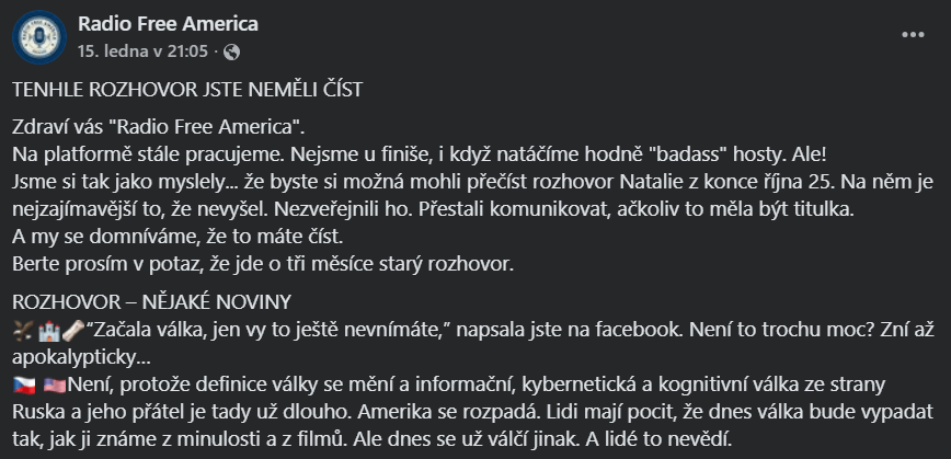 15. ledna 2026 na FB profilu Radio Free America uveřejnila Natálie Kocábová rozhovor o současném stavu USA, který podle jejích slov poskytla nejmenovanému médiu již v říjnu roku 2025. Nejmenované médium ale po uskutečnění rozhovoru přestalo komunikovat. Informace z rozhovoru považujeme za důležité svědectví dnešní doby a proto jsme se rozhodli k jejich zveřejnění.