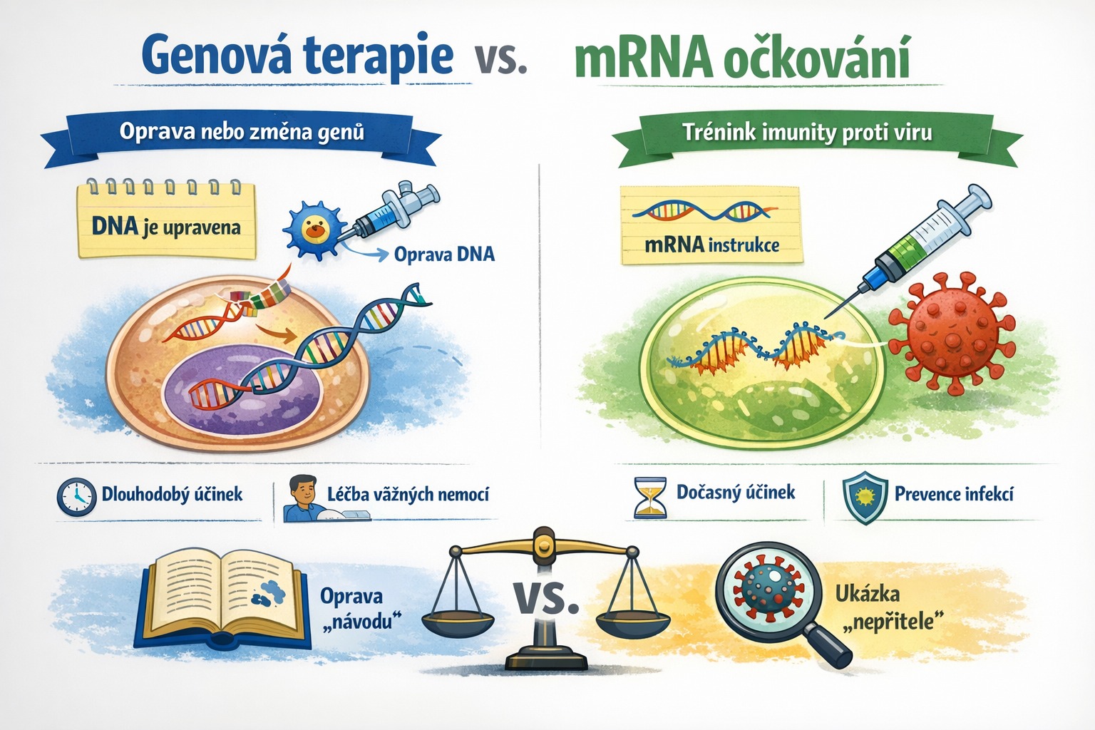 Zjednodušeně řečeno, genová terapie upravuje „návod“ v našem těle, zatímco mRNA očkování pouze ukazuje imunitnímu systému, jak vypadá nepřítel.